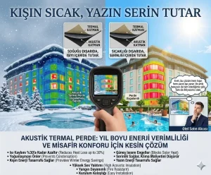 30 yıllık tecrübemizle mekanlarınıza yalnızca estetik değil, aynı zamanda dünya standartlarında güvenlik, konfor ve çok yönlü kullanım avantajı sunuyoruz. Yeni nesil koleksiyonumuzun en önemli özelliği, çift taraflı – çift renkli – çift yüzlü olarak kullanılabilen akustik kumaş teknolojisidir. Bu özel yapı sayesinde perde, masa örtüsü veya yatak örtüsü olarak kullandığınız ürünleri yıkama sonrası ters çevirerek bambaşka bir renk ve dekorasyon etkisiyle yeniden kullanabilirsiniz. Tek üründe iki farklı görünüm sunan bu yenilik, oteller ve profesyonel mekanlar için hem estetik hem de operasyonel avantaj sağlar.