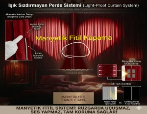 Geleneksel fermuar ve cırt bant devri kapanıyor. Esnek manyetik mıknatıs kordon ve manyetik fitil sistemleri; otel, konut ve ticari mekanlarda ışık sızdırmaz tam kapanma sağlar.