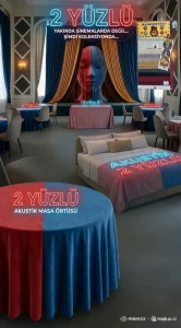 Otel lobisi, restoran, SPA, düğün, balo ve konferans salonları için geliştirdiğimiz çift taraflı termal akustik kumaşlarımız;